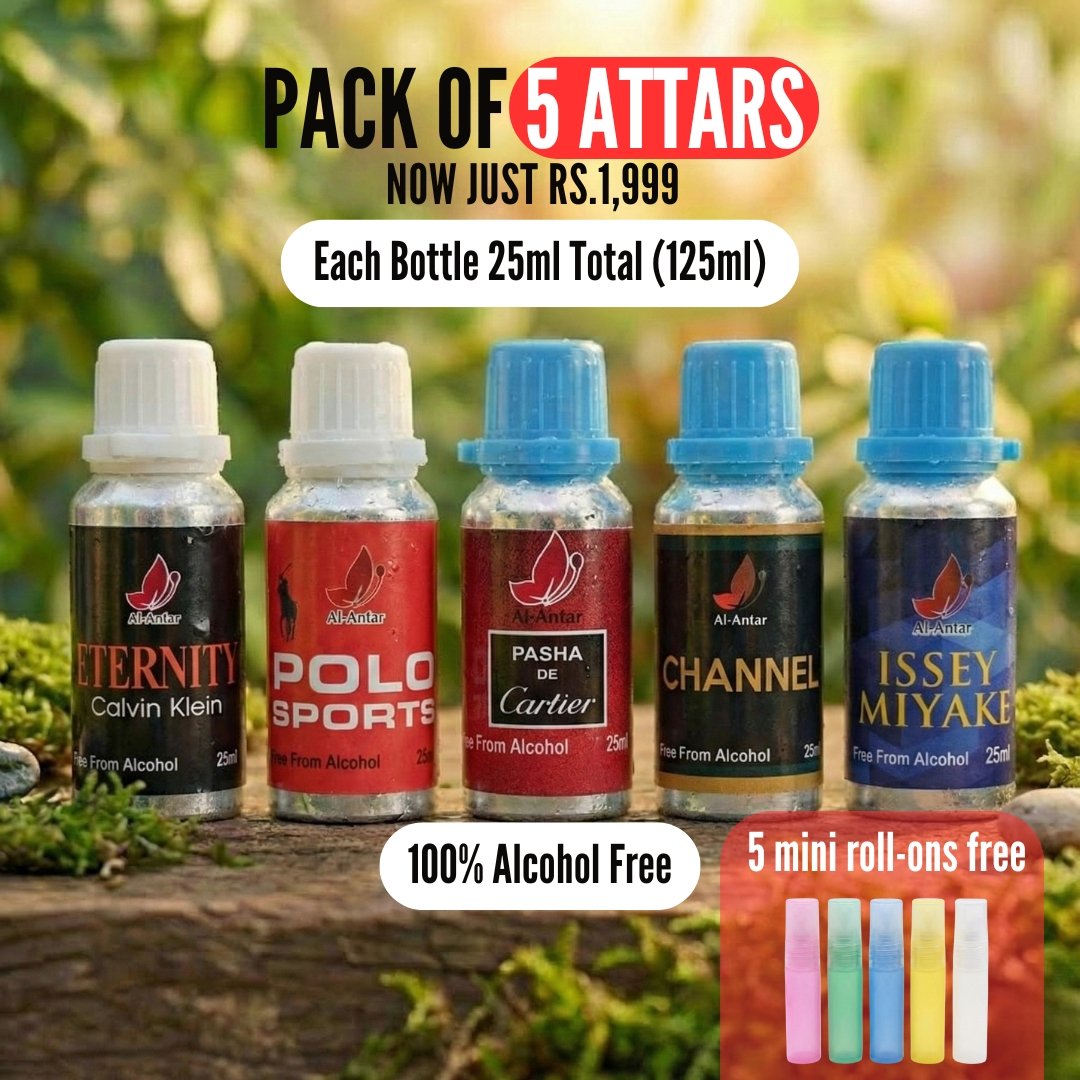Pack of 5 alcohol-free attars inspired by premium designer-style fragrances. Elegant, modern scents suitable for office, daily wear, and special occasions, offering 6–10 hours long-lasting fragrance.